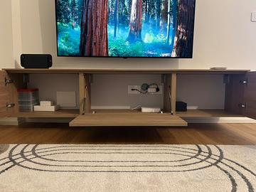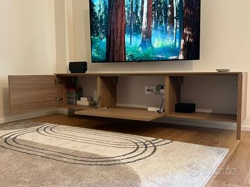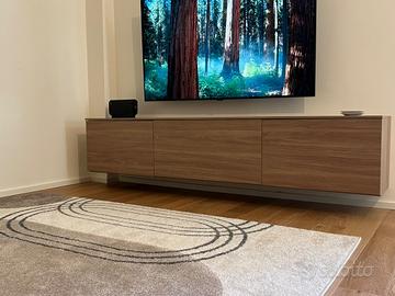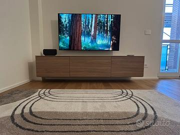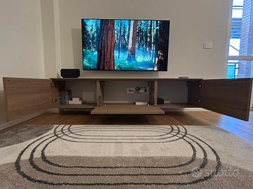 Elegantissimo mobile TV sospeso marca Cinquanta3. Realizzato in laminato noce naturale con interno color perla. Il mobile dispone di ante laterali battenti a chiusura push e di un'anta centrale ribaltabile sempre con chiusura push, perfetta per nascondere dispositivi elettronici. Predisposizione per passaggio cavi. Occasione!