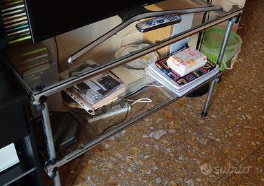 Mobile moderno in vetro e tubi di metallo fatto fare su misura. L.100xP.45xA.70. Due piani in vetro, struttura in tubo di metallo con snodi neri. Ventose ferma-vetri in dotazione. Già smontato Zona Roma Gianicolense,ritiro a mano.