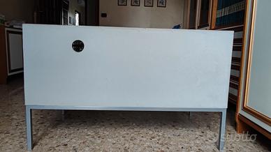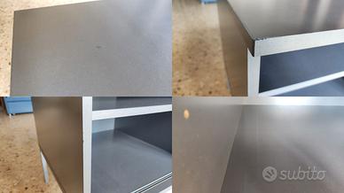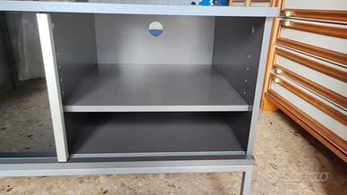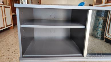 Mobile porta TV Ikea originale usato grigio scuro con ante scorrevoli in vetro e maniglia in alluminio. Dimensioni totali: larghezza 97 cm, altezza 60 cm, profondità 50 cm. Dimensioni dei 2 scomparti interni (ciascuno): larghezza 46 cm, altezza 34 cm, profondità 46 cm. Il mobile presenta qualche imperfezione dovuta all'uso (vedi ultima foto): sul piano superiore una abrasione mette in evidenza il colore nero sottostante, l'angolo e lo spigolo a destra hanno delle tacche dovute ad un urto, all'interno dei due scomparti sono presenti graffi superficiali. Tutte queste imperfezioni sono ben visibili in foto ma ad occhio nudo e a una distanza di utilizzo si notano a mala pena. Il mobile quindi si può dire in buono stato. Il mobile è già stato ripulito ed è pronto all'uso. Disponibile solo per ritiro in Torino città.
