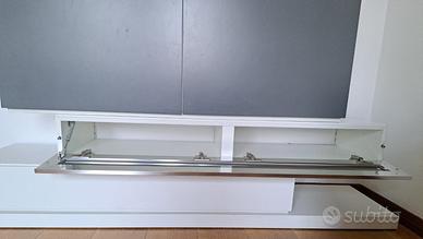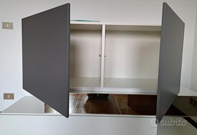 Vendo mobile TV moderno colore bianco e grigio, usato poco si presenta molto bene con segni minimi di usura superficiale o graffi impercettibili, visibili solo da vicino causati dal vecchio proprietario. Dotato di una base a terra da metterci sopra il vano cassetto e il vano con vetro e il pensile con ante da appendere al muro con all’interno due mensole in vetro. MISURE: -Base L196xH6xP43 -Cassetto/Vano L130xH19xP43 -Pensile L130xH58xP43