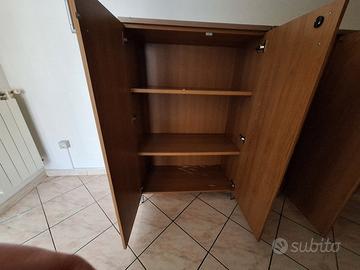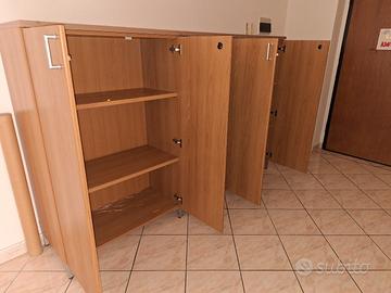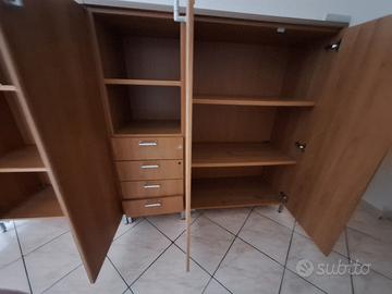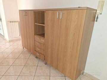 Mobile Ufficio Modulare Rovere - 225 lunghezza x altezza 142 cm - Ottimo Stato Vendo mobile contenitore professionale, ideale per ufficio, studio o archivio, in finitura effetto rovere chiaro. La struttura è solida e versatile, perfetta per l'organizzazione di faldoni e documenti grazie alla sua altezza di 142 cm. Composizione e Dimensioni: Il mobile ha una larghezza totale di 225 cm, suddivisa in tre moduli •2 Moduli Laterali (L 90 cm cad.): Ampi vani con doppia anta battente e ripiani interni rinforzati. •1 Modulo Centrale (L 45 cm): Vano a giorno superiore e cassettiera inferiore a 4 cassetti Dettagli Tecnici: •Altezza: 142 cm. •Piedini: In metallo satinato, garantiscono stabilità e facilitano la pulizia del pavimento. •Maniglie: Design moderno in finitura satinata. Mobile ubicato al secondo piano di un fabbricato condominiale dotato di ascensore, smontaggio e trasporto (almeno 2 persone) carico dell'acquirente.