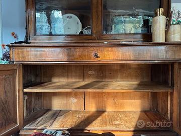 Elegante credenza in noce metà/fine '800 , sovrastata da un'ampia vetrina a due ante, ideale per esporre porcellane, cristalli o collezioni d’epoca e servita da 1 ampio cassetto funzionale. Un mobile a doppio corpo dalle linee sobrie e proporzionate, angoli stondati e cornice superiore curva che offre uno spazio contenitivo generoso. Vetri originali in cristallo soffiato. Completo di stacco modanato, incluso ma non montato. Adatto anche per arredamento ristorante o negozio. Mobile di famiglia, vendo per trasferimento. Solo ritiro in loco.