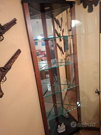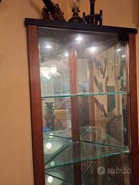 Mobile in noce con le basi nere, ripiani in vetro e schienali a specchio.
