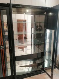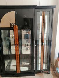 Mobile vetrina in legno con inserti in radica di noce, con ripiani interni in vetro con illuminazione interna. Il profilo superiore destro anteriore in vetro è mancante come da foto. Misure altezza 215 cm, profondità 43 cm, larghezza 213 cm