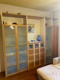 Mobile vetrina in legno con ante in vetro opacato. Vetrina con ripiani interni in vetro, parte centrale a cassetti, mobile in legno laterale conposta da due colonne con ripiani interni. Misure: 275 h x 230 l x 42 profondità Ritiro e trasporto a carico dell'acquirente.