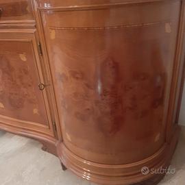 Si compone di mobile con ante battenti la parte sottostante e di 3 vetrine 1 centrale 2 ante e 2 lateralmente particolari, sono a vetro fuso e arrotondate.Il mobile è come nuovo tenuto in modo impeccabile.