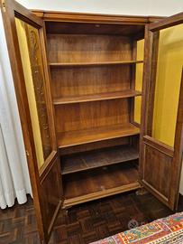 Mobile vetrina - libreria in legno massello con decorazioni in rilievo. Misure cm 118 L x 175 H x 45 P.