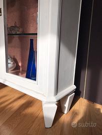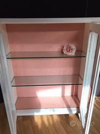 stupendo mobile vetrina shabby in legno massello vetro e piano in marmo, Il legno chiaro presenta delle tracce di usura molto autentiche, che gli conferiscono un bel carattere vintage. con base in marmo Il design si abbina perfettamente ad arredamenti in stile shabby chic o country, oltre che a quello Long Island.( anni 50)