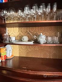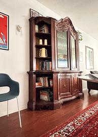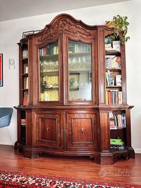 Mobile vetrina retrò, in legno, completo di porte cieche nella parte bassa e di ante in vetro trasparente nella parte alta. Dimensioni 230cm lunghezza, 210/235cm altezza e 55cm profondità. Utilizzabile come credenza o libreria, in buono stato, da vedere.