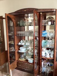 Vetrina mobile in cristallo e legno tinta radica quattro ante stondate di cui due stondate e due cassetti nelle ante centrali con ripiani in cristallo e faretti .