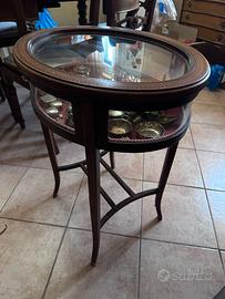 Il tavolino a bacheca ovale (spesso chiamato anche vitrine table o bijouterie), è un pezzo d'arredamento d'area classica ed elegante progettato per l'esposizione di piccoli oggetti di valore (nel caso specifico gli oggetti mostrati nelle foto sono già stati venduti). Il mobile presenta una forma ovale con un piano in vetro trasparente incassato in una cornice di legno. La cornice è decorata con un raffinato intarsio a motivo geometrico (filettatura) che corre lungo tutto il perimetro. Al di sotto del vetro si trova un vano protetto da pareti laterali anch'esse in vetro, che permettono una visione a 360 gradi del contenuto. L'interno è rivestito in velluto rosso, ideale per far risaltare oggetti in argento, gioielli o curiosità da collezione. Poggia su quattro gambe sottili e arcuate (stile "sciabola" o leggermente mosse), collegate tra loro da una crociera di rinforzo a forma di X, che garantisce stabilità alla struttura slanciata. Lo stile si ispira allo stile Luigi XV o Neoclassico, tipico dei mobili da salotto europei del XVIII e XIX secolo. È un pezzo che comunica leggerezza e raffinatezza.