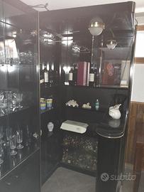 Mobile nero lucido marmorizzato con vetrina nella parte superiore e vani chiusi nella inferiore. Struttura angolare con mobile bar e luce a soffitto. Solo ritiro in loco