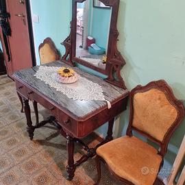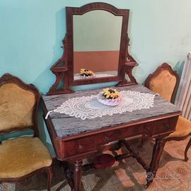 Elegante mobile in stile antico con specchio reclinabile e 2 sedie coordinate.