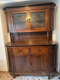 Vendo credenza vintage di inizio '900, in legno massiccio stile Liberty. Il mobile si presenta in buono stato, con qualche segno di usura come da foto. Gli armadietti e i cassetti sono dotati di serratura con chiave.