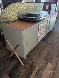 Mobile TV / credenza vintage completamente restaurato, ideale per arredare soggiorno o zona living con uno stile unico e ricercato. Il mobile è stato rinnovato con verniciatura color verde salvia opaco e presenta un’anta decorata con fantasia moderna, che lo rende un vero pezzo unico. Struttura solida, gambe in legno in stile anni ’50. Dotato di ampio spazio contenitivo con ante scorrevoli, perfetto come porta TV o vinili, mobile basso o credenza. Scrivimi pure per altre foto. Misure: 176,5 x 35,5 x 54 (h) Sono a Roatto (AT) ma posso consegnare il mobile. Sono Sonia e mi occupo di rivalorizzare mobili in uno stile vintage che non passa mai di moda. Ogni pezzo è lavorato a mano, non è un semplice mobile riverniciato ma un progetto di restauro e redesign