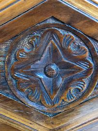 Mobile in legno massello vintage, con intarsi lavorati a mano, decorazioni a basso rilievio in ferro, ottime condizioni.