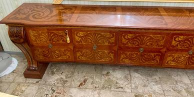 Uno spettacolare mobile credenza in stile classico presenta curve aggraziate e intarsi in palissandro, tulipier e radica.