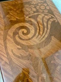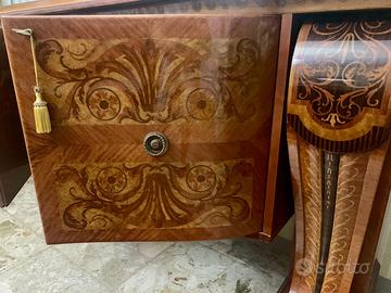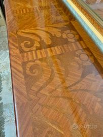 La finitura satinata restaurata è in condizioni eccellenti, con qualche segno sui bordi che le conferisce un tocco di personalità, corredata da tavolo e sedie dello stesso stile vedi foto.