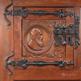 Credenzino Neorinascimento in legno di faggio tinto noce, pannelli intagliati a