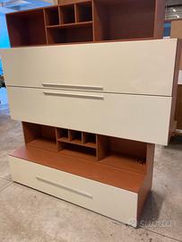 Mobile soggiorno con finitura in ciliegio composto da cassettone estraibile, due ante a ribalta elementi a giorno.