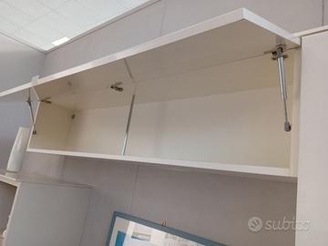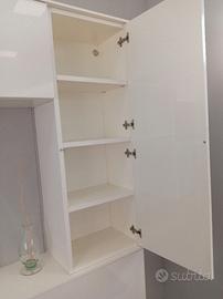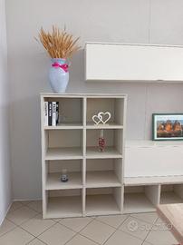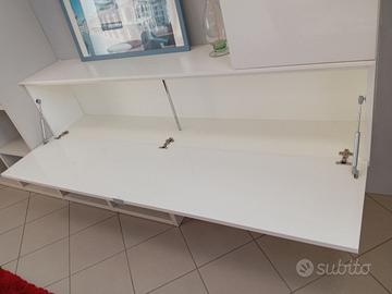 mobile per la zona living/soggiorno moderno nuovo di esposizione. E' proposto in finitura laccato lucido bianco con il particolare della libreria in finitura frassino corda . E' molto capiente con antine apertura a ribalta e rialza , e un vano per eventuale tv sia in appoggio che appesa. Occasione fine serie. Euro 2200.00 scontato a Euro 900.00 . Le misure sono cm. 277 x cm.205 h x cm.35/48 prof.