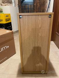 Mobiletti bagno in legno con tre ripiani ciascuno, uno con ripiano in marmo.