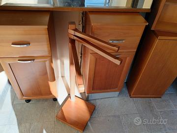 Composizione per bagno composto da 1 specchio a 4 faretti +presa e interruttore dimensione L 105xH115 cm, n. 2 mobiletti apertura Dx/Sx cm 36x36 x85h cassetto e anta con ripiano vetro, n. 1 pensile cm 35x20 con 2 ripiani+sottopensile, n. 1 piantana base quadrata a 3 bracci tutto colore ciliegio, usato buono stato, ideale per lavabo a colonna. NO Spedizione prezzo trattabile