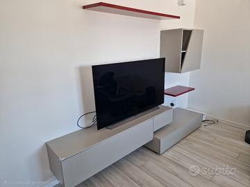 Come foto(escluso televisore) vendo questa composizione di mobiletti di soli tre anni composti da due mensole laccate rosso lucido con perni a scomparsa e mobiletti in laminato grigi di cui un pensile a dx con antina tagliata, una cassettiera in basso a destra ed il centrale sospeso con un cassettino sulla destra e una portina a ribalta. il tutto con accessori di montaggio a muro. Lo sviluppo così come foto è di circa 250 cm di larghezza. tenete conto che la tv è un 50 pollici Sono visionabili in garage in quanto appena smontati. Il trasporto è a cura dell'acquirente