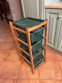 Mobiletto color ciliegio con quattro cestini e uno superiore colore verde scuro, come nuovo. Misure 30x36, altezza 78.