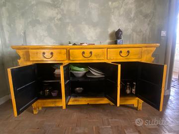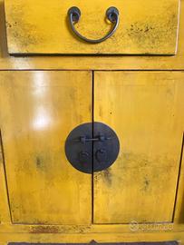 Mobile antico di origine cinese, con una finitura in legno che presenta sfumature gialle e multicolore. Un pezzo d'arredo unico che aggiunge un tocco di storia e colore alla tua casa.