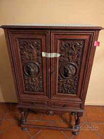Mobiletto a due ante con intagli artigianali profondi, motivo a teste di leone in medaglione. Legno massello scuro, probabilmente fine '800. Due cassettini inferiori. Buone condizioni generali serratura funzionante. Zona Rivarolo Canavese (TO), ritiro a carico acquirente.