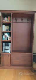 Mobiletto in legno massello, con ripiani, cassapanca e ganci appendiabiti. Misure: alt. cm 190, larg. cm 110, prof. cm 45. (possibilità di chiusura anteriore con due ante, al momento smontate).
