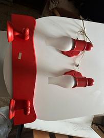 Arredamento bagno rosso in stile vintage realizzato da mobilificio di varese mobiletto,specchio,appendiabiti e luci.