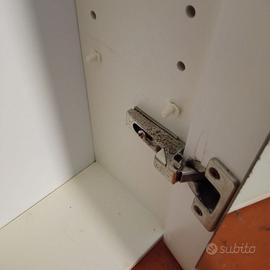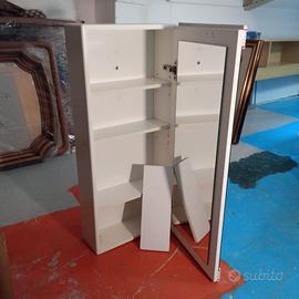 Mobiletto bagno in legno bianco, profili in ceramica bianca con bordini rossi-doppio specchio (esterno-interno)-4 ripiani-misure in cm. 80x35 profondità 13-una cerniera macchiata-alcuni buchini stuccati-da ritirare presso di me: spedizione difficoltosa