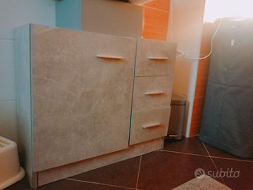 mobili bagno per ospitare prodotti e asciugamani in ordine direttamente nel bagno. la composizione è composta da un mobile colonna alta 190 cm, profonda 30 cm e larga 30 cm. Un mobiletto basso con tre cassetti e due ante da posizionare sotto al lavandino con colonna, altezza 54 cm, profondo 39 cm e lunghezza 60 cm.