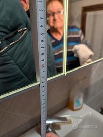 Mobiletto bagno da sopra lavandino con due ripiani interni in vetro, specchio a tutta lunghezza luci led su i due laterali comperato nel gennaio 2025 e praticamente nuovo usato pochissimo. misure 80x64x21 Disponibile da subito.