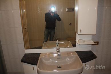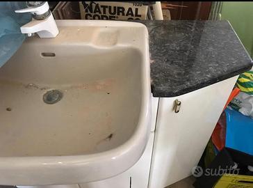 Regalo mobiletto bagno tolto da ristrutturazione ma mai utilizzato. Top in marmo scuro e specchiera abbinata con luce. Il mobiletto è in condizioni pari al nuovo in quanto non è mai stato utilizzato. Basta una spolverata e torna come nuovo. Di alta qualità per l'epoca, legno laccato e marmo.