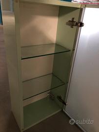 Come nuovo, nessun problema. Mobiletto laccato verde chiaro con anta in vetro per bagno. Ripiani interni in vetro. Vendita causa trasloco. Facile da installare.