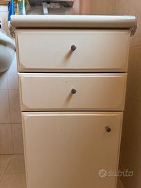 Vendesi mobile contenitore per bagno a terra, configurazione a colonna bassa. Design funzionale con frontali lavorati a rilievo (cornice perimetrale sagomata sui pannelli). La parte superiore presenta 2 cassetti estraibili con guide standard mentre quella inferiore: 1 vano con anta e spazio interno portaoggetti. La finitura opaca è color crema/beige chiaro. Presenza di pomelli circolari in metallo satinato su tutti i frontali. Top superiore stondato con bordo integrato. Struttura solida e stabile. Cassetti e anta perfettamente funzionanti. La superficie presenta lievi segni di usura quotidiana e piccoli graffi superficiali coerenti con l'utilizzo.