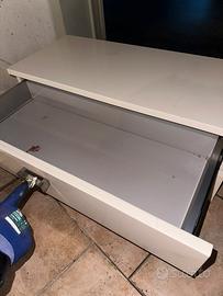 Mobiletto in bagno con due casetti spaziosi , maniglie in acciao inox, legno conpensato di prima qualita ( lo si deduce dal peso) con verniciatura in polvere colore bianco .