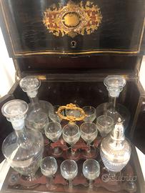 Mobiletto bar da viaggio in legno ebanizzato intarsiato in ottone e madreperla. Secolo 19º. preferibile ritiro diretto.