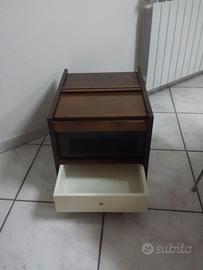 Mobiletto bar anni 70 - 80 ad apertura superiore con vetrinette laterali e cassetto inferiore scorrevole sui due lati. Dimensioni 55x44 cm altezza 45 cm., vano bar altezza utile 21 cm. .