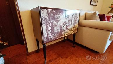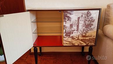 Vendo mobile bar vintage degli anni 50,in ottimo stato. Con serigrafia seppiata sulle antine, stile "Fornasetti". Interno diviso in 2 parti,una con ripiano in vetro e pareti rosse e nell'altra vano per bottiglie con fondale a specchio e luce interna. Misure:larghezza 81 cm, profondità 39 cm, h mobile 45 cm, h da terra mobile + gambe 82 cm. Prezzo trattabile Fate un'offerta che trattiamo