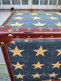 Il mobile è rivestito in tessuto con la stampa della bandiera americana (USA) effetto invecchiato, con profili in similpelle e borchie metalliche in stile industrial.