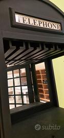 Mobiletto cantinetta cabina telefonica inglese, mobiletto cantinetta realizzato in legno con vani porta bicchieri e bottiglie. La cabina telefonica ha una porta a vetro e un interno con uno specchio, un cassetto e vani porta bicchieri e bottiglie. Dimensioni: • Altezza: 201 cm • Larghezza: 72 cm • Profondità: 40 cm Per qualsiasi informazione non esitate a contattare