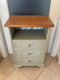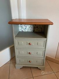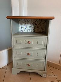 Comodino vintage restaurato, unico nel suo genere. La struttura è stata rinnovata mantenendo il top in legno naturale, mentre i tre cassetti presentano frontali lavorati e dipinti in una tonalità verde-grigia delicata, con pomelli in finitura rame/rosato che aggiungono un tocco elegante. Il lato aperto rivela un vano interno rivestito con carta decorativa a motivo floreale, che dona carattere e un contrasto raffinato. Perfetto come comodino, mobiletto d’ingresso o cassettiera Dimensioni 49x31cm altezza 75cm