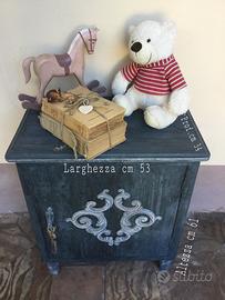 Vendo grazioso mobiletto in legno in stile vintage, completamente restaurato e dipinto a mano con tecnica delabrè in una raffinata tonalità blu effetto shabby.