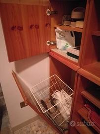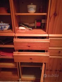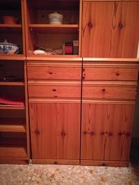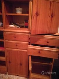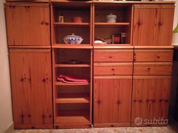Quattro elementi componibili in pino di Svezia. Ciascun elemento è composto da due elementi, uno più grande che fa da base e uno sovrastante più piccolo. Gli elementi sono collegati fra di loro tramite viti passanti, ma si possono tranquillamente separare tutti. Ottime le condizioni, anche se il mobile risale agli anni '80. Altezza 128 cm, profondità 34 cm, larghezza di ciascun elemento 39 cm. E' nell'insieme elegante e si adatta molto bene anche ad altri ambienti. Eventualmente vendo, della stessa collezione, e stesso legname, anche il porta asciugamano grande e piccolo ed il porta carta igienica.