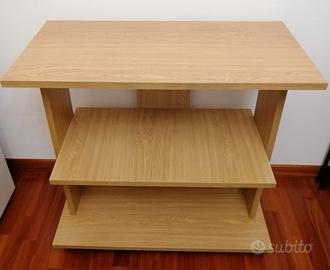 Mobiletto con ruote, colore noce chiaro, con tre ripiani. Uso versatile. In perfette condizioni, come nuovo. Dimensioni: Lunghezza: 78 cm; Profondità: 40 cm; Altezza: 75 cm.