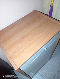 Mobile multiuso con un'anta e interno 2 ripiani e un cassetto, in stile moderno, con struttura e pannelli laterali color legno e frontali bianchi.